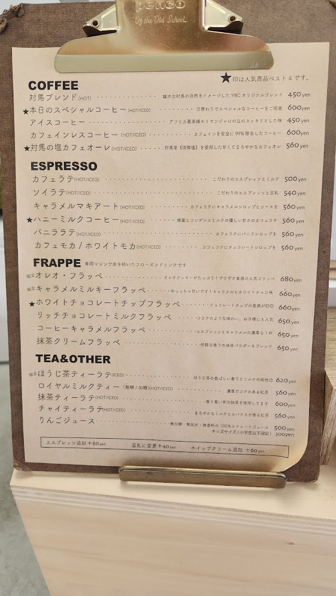 For tea lovers, the ロイヤルミルクティー (JP¥580) is a must-try, offering a rich and indulgent experience, while the 抹茶ティーラテ (JP¥600) brings a delightful touch of traditional Japanese flavor with its velvety Uji matcha. And don't miss out on their decadent ホットチョコレート (JP¥630), a favorite among kids and adults alike, perfect for those chilly Tsushima days.